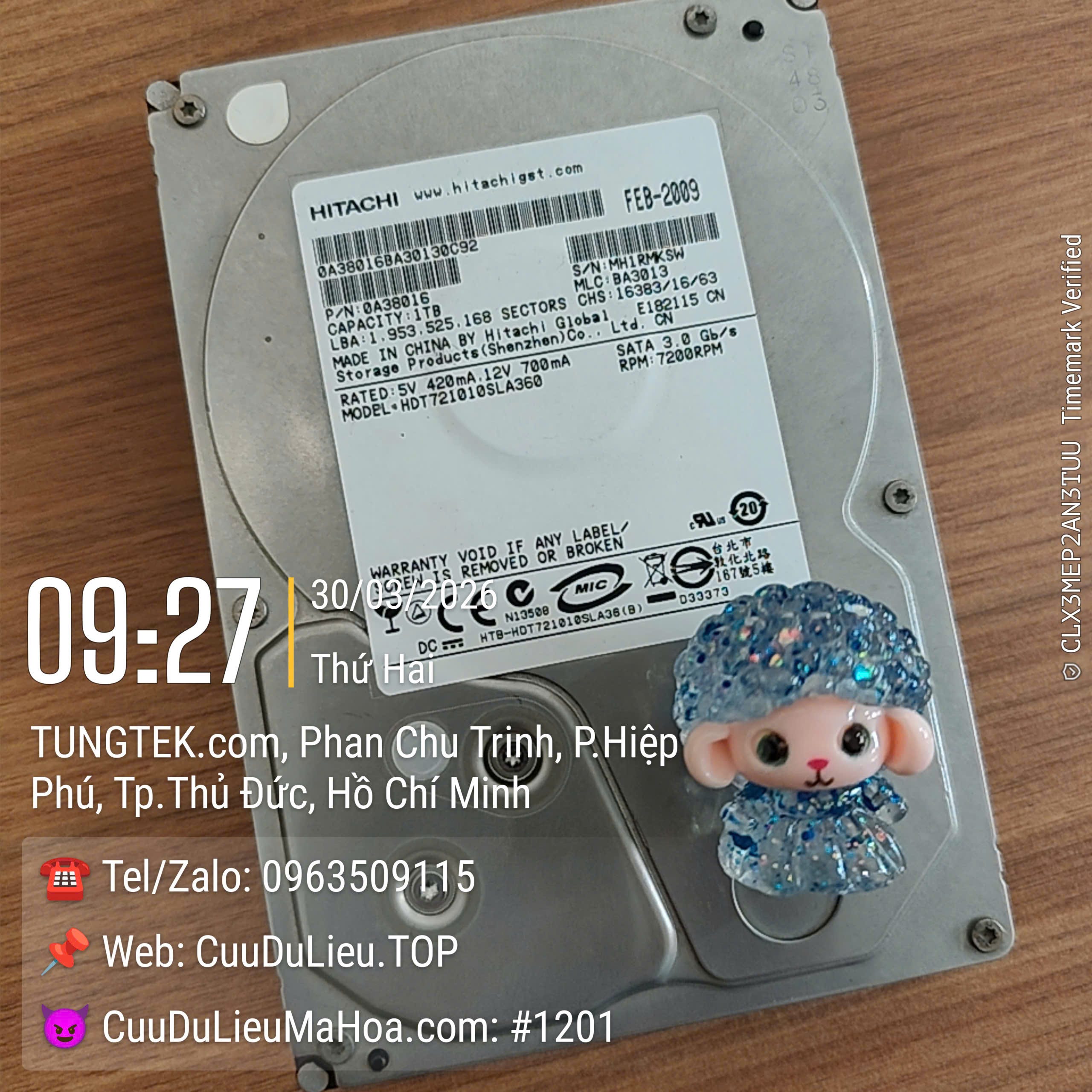 Nhìn vào bức ảnh này, bạn có thấy điều đặc biệt không? Đó là một “ông cụ” ổ cứng Hitachi dung lượng 1TB. “Thẻ căn cước” ghi rõ: Sinh tháng 02 năm 2009! Ối giời ơi, 17 năm thanh xuân! Thú thật là tuổi nghề của cụ có khi còn lớn các con của Tùng. 😉